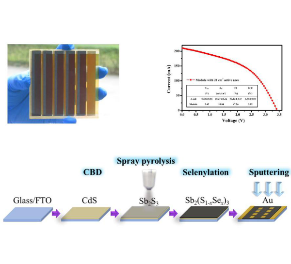 该论文采用超声喷雾热解技术,在大气环境下制备出Sb2S3薄膜,并基于有源扩散模型,研究了硒化的扩散过程及对薄膜晶体结构、能带结构及载流子传输过程的影响。实验借助快速硒化工艺提升Sb2S3薄膜的结晶质量,获得了4.57 %效率的Sb2S3(Se)太阳能电池,成功地制备了80×80 mm2的大面积器件。该方法制备的电池成本不及真空制备的一半,预计在3年内可以实现转化。