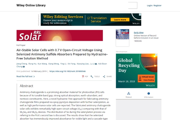 该论文采用超声喷雾热解技术,在大气环境下制备出Sb2S3薄膜,并基于有源扩散模型,研究了硒化的扩散过程及对薄膜晶体结构、能带结构及载流子传输过程的影响。实验借助快速硒化工艺提升Sb2S3薄膜的结晶质量,获得了4.57 %效率的Sb2S3(Se)太阳能电池,成功地制备了80×80 mm2的大面积器件。该方法制备的电池成本不及真空制备的一半,预计在3年内可以实现转化。